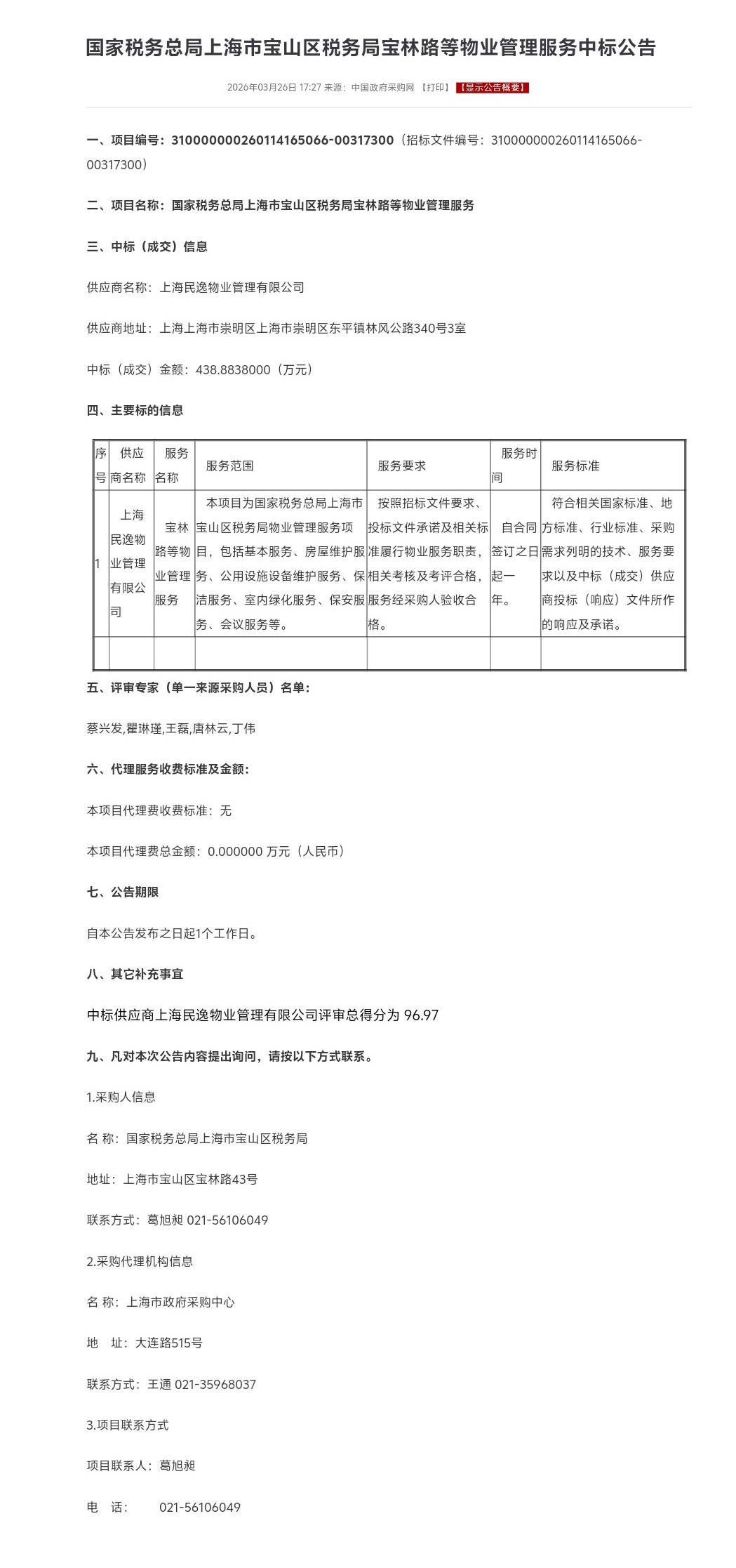 國家稅務總局上海市寶山區稅務局寶林路等物業管理服務中標公告