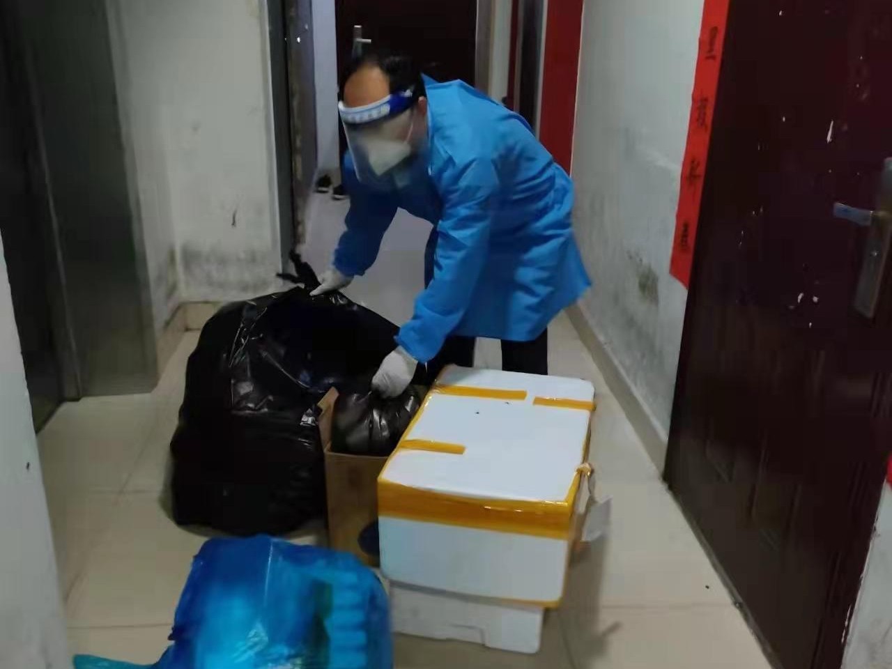 下午1點,全社區的核酸檢測工作結束,王偉龍近七個小時滴水未進,他在居委污染物集中點按流程脫下防護裝備再回家吃飯休息。4點半,當物資運輸車開進小區,王偉龍便再次和志願者們,穿上藍色工作服,戴好口罩手套,開始卸貨分裝,再逐樓送到小區各家各戶,當結束再次回到家中時,已是晚上10點。