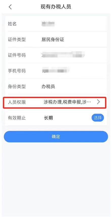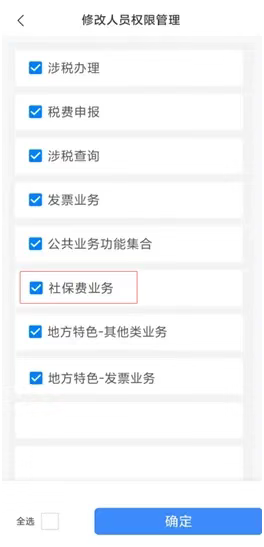 企業法定代表人、財務負責人或管理員可使用企業業務身份登錄電子稅務局App,在【我的】-【賬戶中心】可以對該辦稅員進行社保費業務的賦權。 操作步驟: 1、企業法定代表人、財務負責人或管理員登錄電子稅務局App後,點擊【我的】,選擇並進入【賬戶中心】。 2、在賬戶中心中點擊【人員許可權管理】, 進入【現有辦稅人員】。 3、選擇需要進行許可權管理的人員身份類型,並點擊【查詢】。 4、選中需要管理許可權的人員點擊【管理】,進入【現有辦稅人員】頁面,點擊【人員許可權】進入【修改人員許可權管理】頁面,選中【社保費業務】點擊確認,該辦稅員重新登錄即可進入社保模組,辦理社保業務。 溫馨提示:在辦理社保業務前,請確認App的左上角選擇的地區為【上海】。