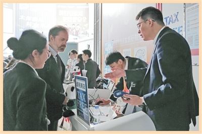 第八屆進博會期間,工作人員協助外籍人員辦理離境退稅手續。