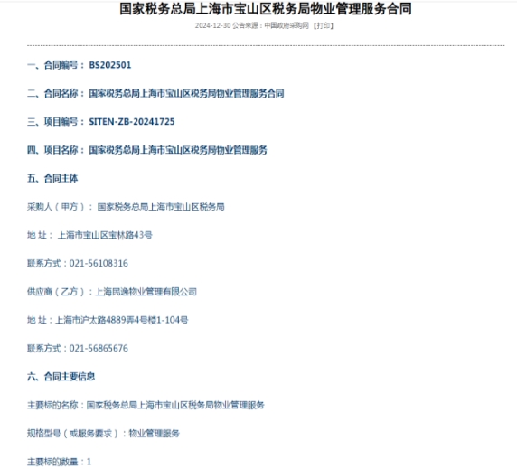 國家稅務總局上海市寶山區稅務局物業管理服務合同公告