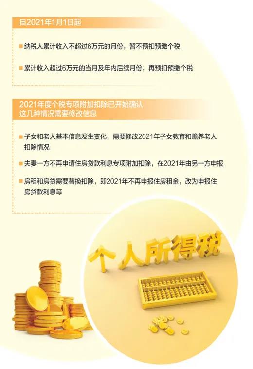 也就是説,自2021年1月1日起,對於符合條件的納稅人,在其累計收入達到6萬元之前的月份,暫不預扣預繳個人所得稅;在其累計收入超過6萬元的當月及年內後續月份,再預扣預繳個人所得稅。