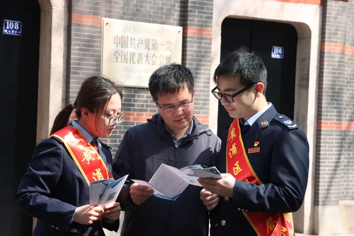 黃浦區稅務局依託黃浦區豐富紅色資源,在“黨的初心始發地”——中共一大會址前開啟第33個稅收宣傳月,組織幹部為前來參觀會址的群眾答疑解惑,宣傳了個人所得稅年度匯算清繳等方面政策,用“初心紅”映照“稅務藍”,深度融合紅色地標與稅收普法。