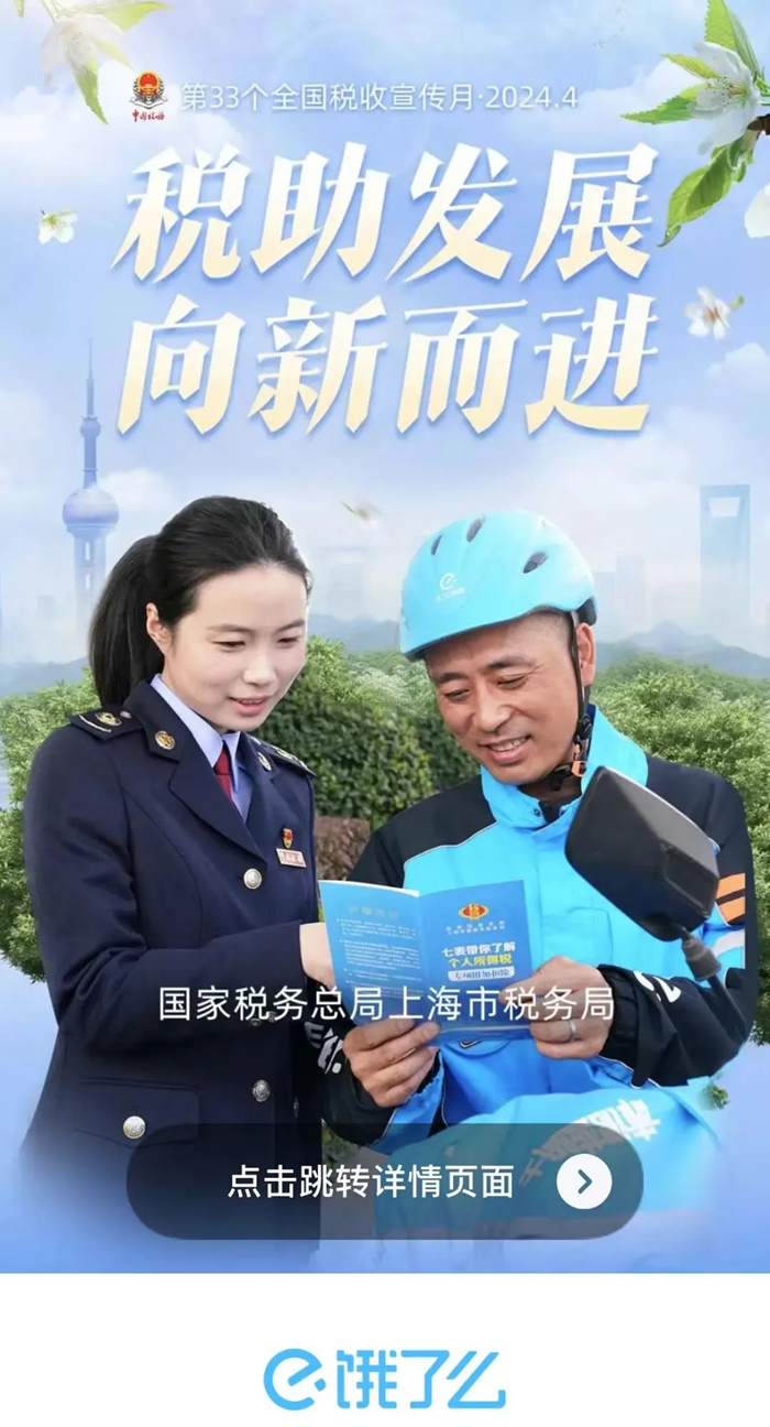 普陀區稅務局連續第4年聯動平臺經濟企業“餓了麼”,特別策劃製作稅務人攜手“藍騎士”主題海報,推出2024年《政府工作報告》稅費內容H5頁面,線上投送“稅宣外賣”,瀏覽量超153萬人次,進一步推動稅法宣傳接地氣、廣覆蓋、惠民生。