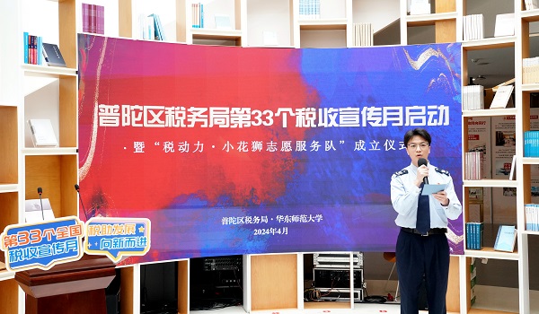 4月2日,第33個全國稅收宣傳月普陀啟動儀式在華東師範大學普陀校區舉辦,現場舉行“稅動力·補給站——華東師範大學稅費政策服務站”揭牌儀式,為“稅動力·小花獅志願服務隊”授旗,併為志願者培養單位頒發聘書。