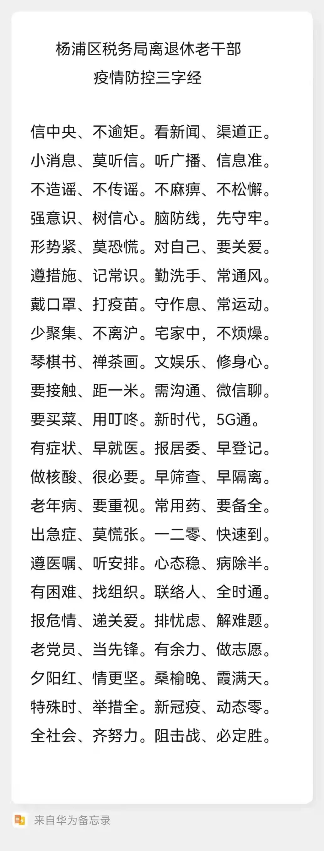 他還原創了《楊浦區稅務局離退休幹部疫情防控三字經》《在疫情防控特殊時期給老同志們的一封信》,向老同志們傳播了抗疫防護知識,傳達了戰“疫”必勝的信念,受到了廣泛好評。