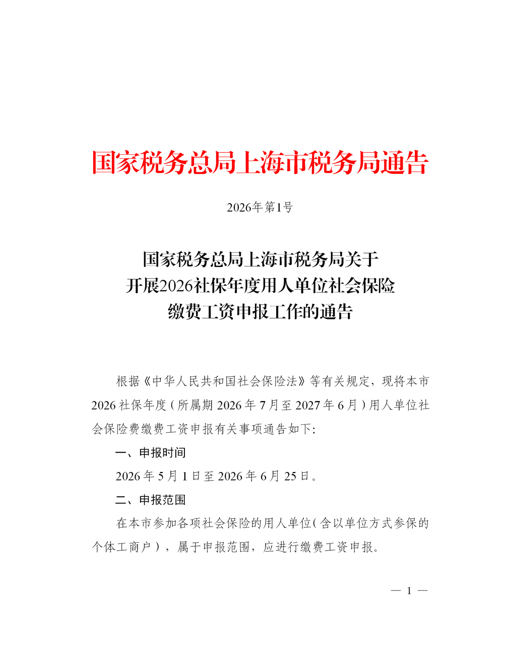 根據《中華人民共和國社會保險法》等有關規定,現將本市2026社保年度(所屬期2026年7月至2027年6月)用人單位社會保險費繳費工資申報有關事項通告如下: