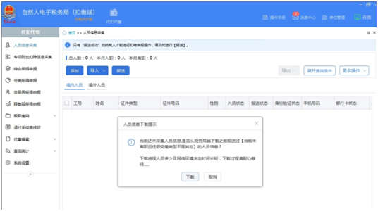 一、没有备份数据更换电脑,自然人电子税务局(扣缴端)中数据丢失,怎么处理? 需要实名办税人员到办税服务厅申请开通【扣缴端数据下载】的功能权限,就能在72小时内在自然人电子税务局(扣缴端)下载个税数据。申请之后就可以在线操作,具体步骤: ① 登录后系统弹出“当前还未采集人员信息,是否从税务局端下载之前报送过【当前未离职且任职受雇类型不是其他】的人员信息?”对话框,点击【下载】。 ② 输入短信验证码验证后,即可做人员信息维护。 ③ 点击【查询统计】-【单位申报记录查询】-选择恢复月份的【查看明细】,并填写短信验证码,即可查看、下载往期个人所得税扣缴申报表。 注意:分部门申报的企业无法下载个税数据。
