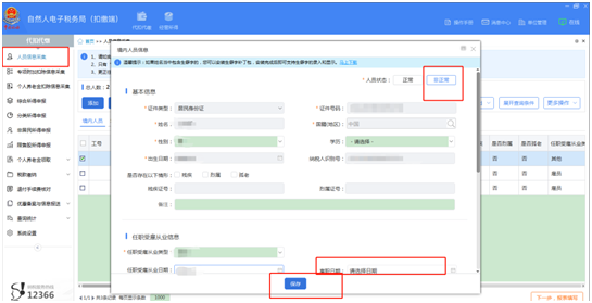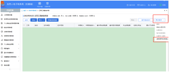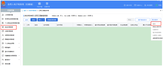 三、自然人电子税务局(扣缴端)中,人员离职后如何从正常工资薪金表中删除该人员? ① 先在【人员信息采集】界面,找到该员工,双击姓名打开,填写离职日期,右上角选择【非正常】,保存后报送。 ② 点击【综合所得申报】—【正常工资薪金所得】—【选择人员】,点击【更多操作】-【删除】。