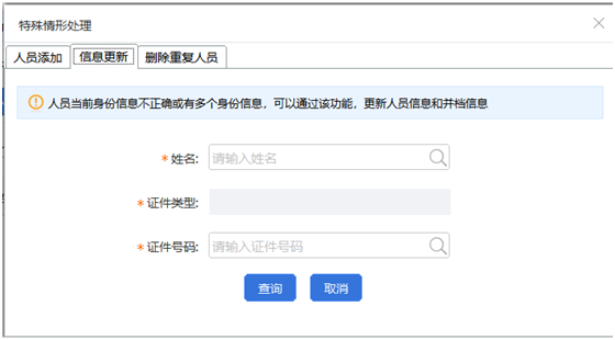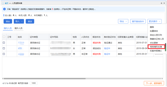 四、外籍人员的证件号码发生变更,完成并档之后,自然人电子税务局(扣缴端)如何更新? ① 在人员信息采集里,把原来的人员改为非正常状态,录入新的证照号码,并报送成功; ② 点击【人员信息采集】—【更多操作】—【特殊情形处理】—【信息更新】,即可实现把之前证照号码的申报数据累计到新的身份信息上。