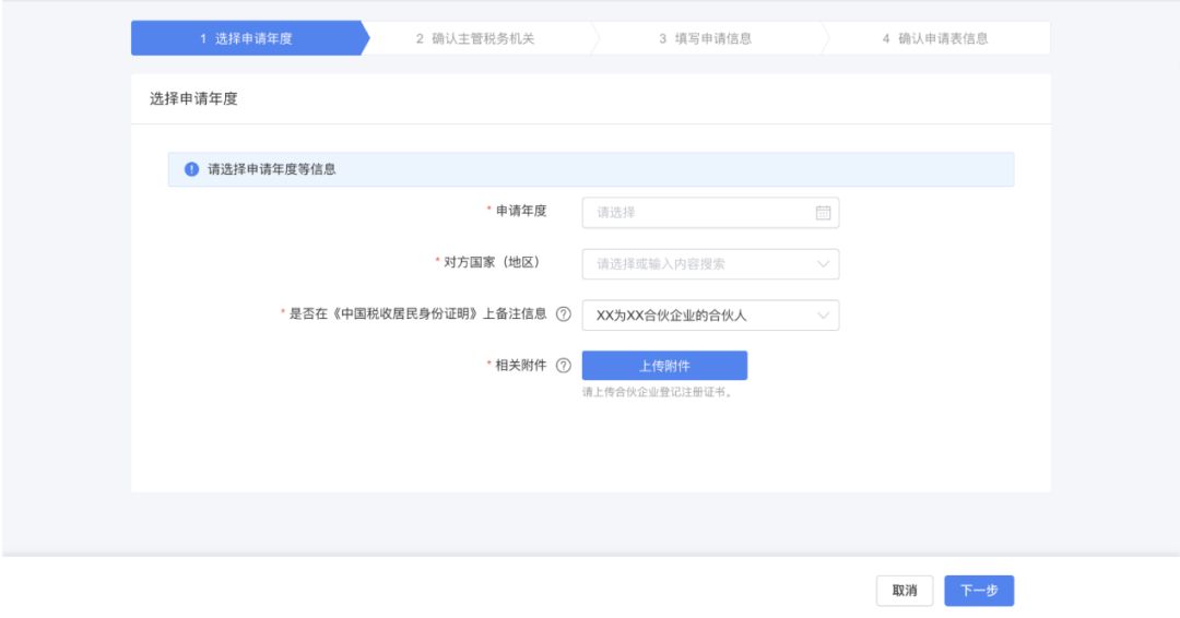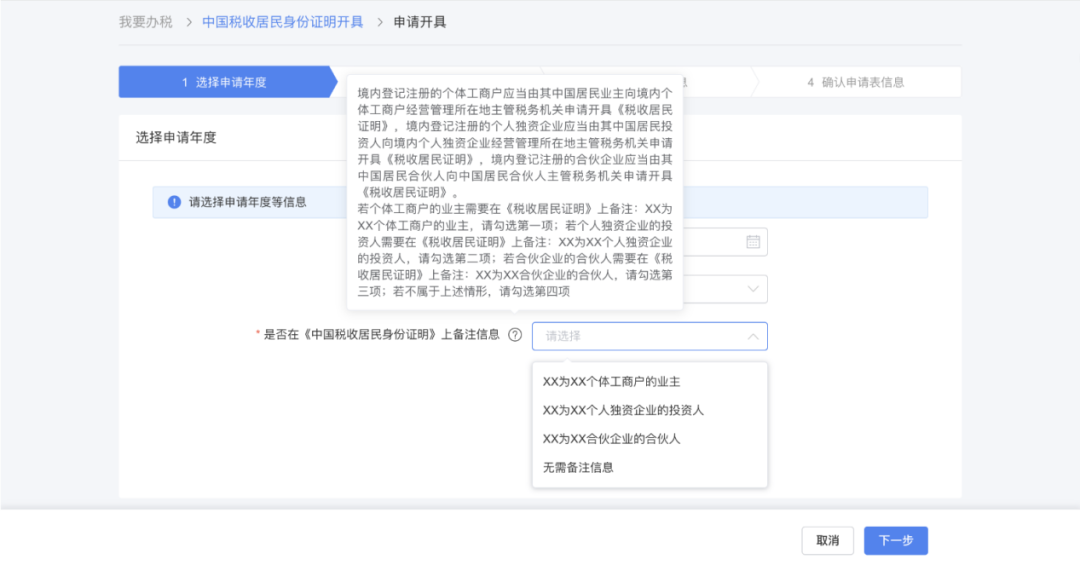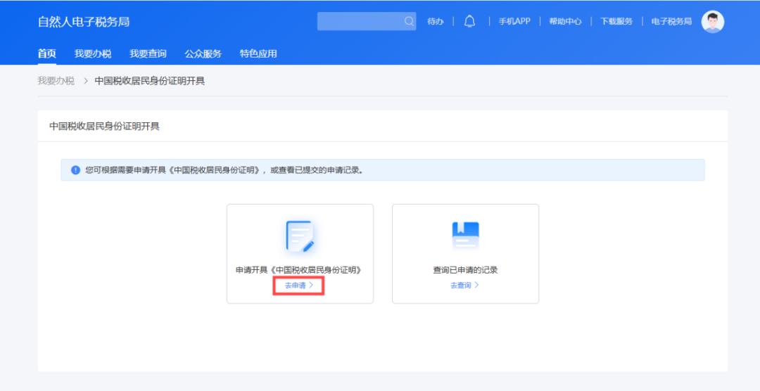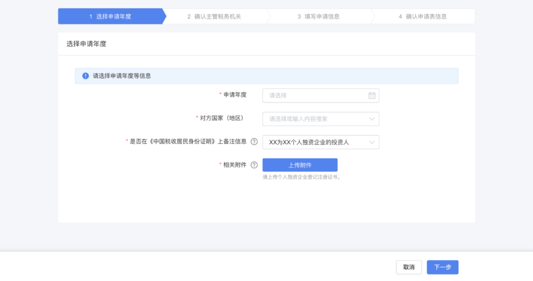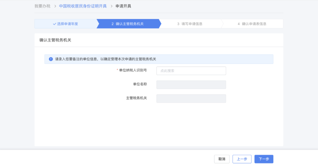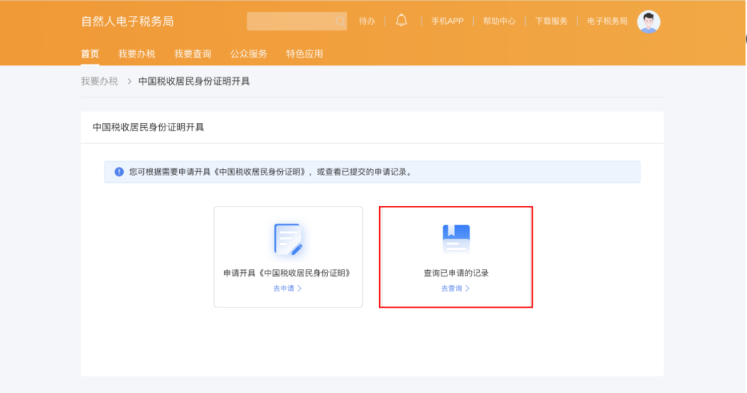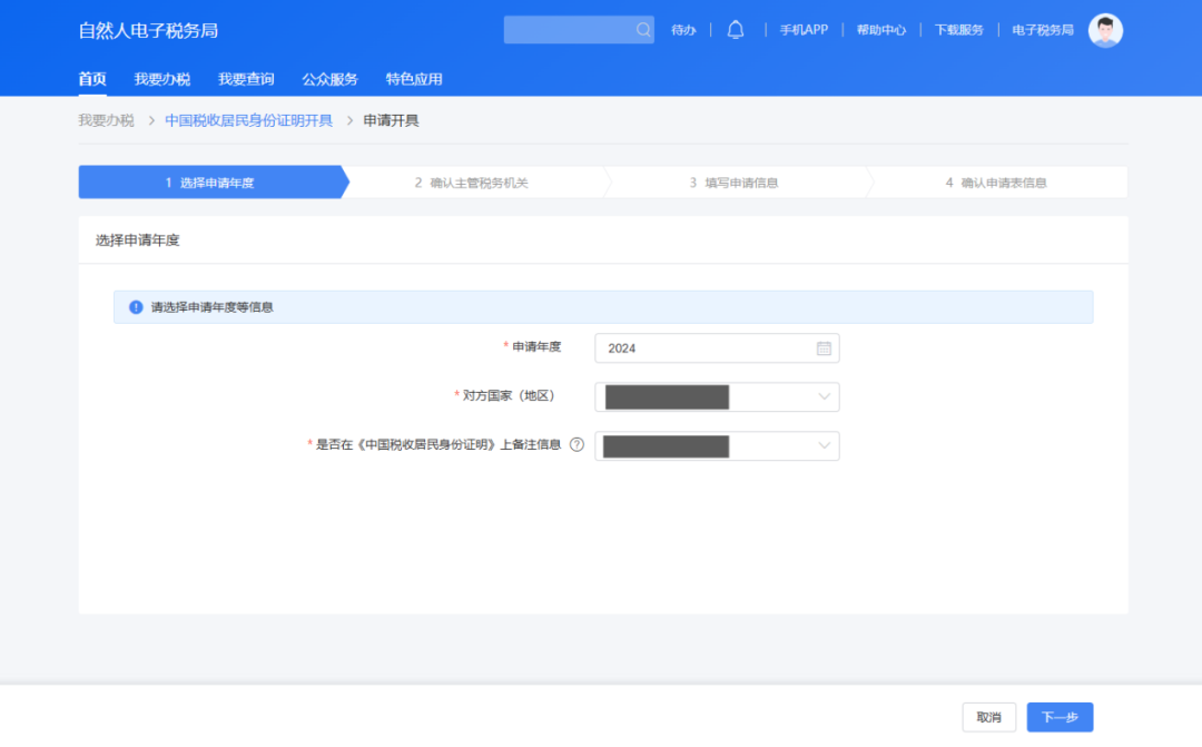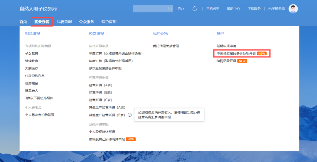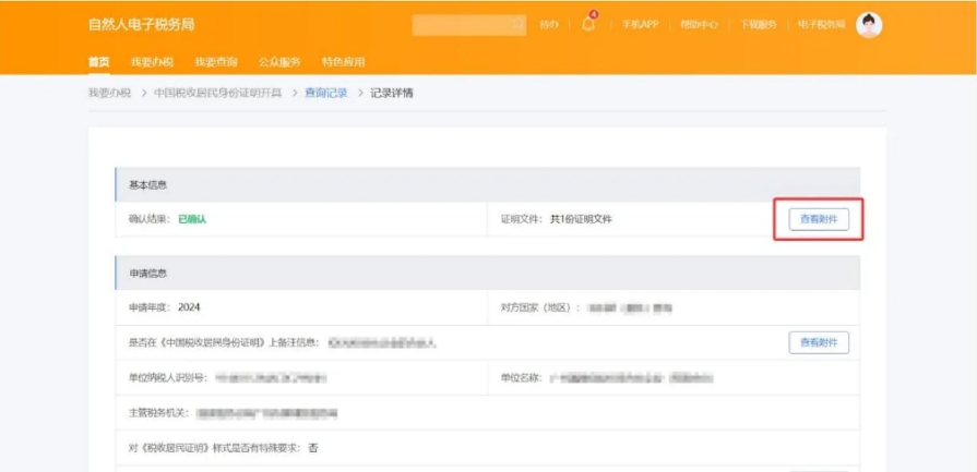 居民个人新版中国税收居民身份证明线上办理流程如下: 第二步,系统将提示办理须知,勾选【我已阅读并知晓】,进入填报。 第三步,选择申请年度。需填写申请年度、对方国家(地区)及是否在《税收居民证明》上备注信息。申请人可以就其构成中国税收居民的任一公历年度开具《税收居民证明》。 若申请人为中国境内注册登记的个体工商户、个人独资企业或合伙企业,并且需要在《税收居民证明》上备注信息,请按自身登记注册类型勾选对应选项并上传登记注册证书;若不属于上述情形,请勾选【无需备注信息】。 第四步,确认主管税务机关。若申请人在“是否在《中国税收居民身份证明》上备注信息”勾选【无需备注信息】,主管税务机关规则可选择【户籍所在地】或【经常居住地】。 若申请人在“是否在《中国税收居民身份证明》上备注信息”勾选相关选项,需录入要备注的单位信息,以确定受理本次申请的主管税务机关。点击【单位纳税人识别号】,可在弹窗中输入统一社会信用代码或单位名称,点击【搜索】,查询单位信息。如“快捷搜索”未查询出您的企业,可点击切换为“精准搜索”进行查找。“单位所在省(市一级)”选择企业所在省/市,输入统一社会信用代码进行搜索。 以合伙企业为例,查询到单位信息后,勾选企业,点击确认添加,如申请人与被选企业存在投资关系,系统提示“《税收居民证明》的纳税人名称后拟备注:XX(居民个人名称)是XXXXX(企业名称)的合伙人”;反之,系统提示“您与该单位不存在投资关系,不可备注该企业。” 录入需备注的单位信息后,点击【下一步】。 第五步,填写申请信息。如果“对《税收居民证明》样式是否有特殊要求”选择【是】,需上传“需要特殊样式的书面说明以及《中国税收居民身份证明》样式”,“证明领取方式”只能选择【大厅领取】。 “申请目的”可选择【享受协定待遇】或【非享受协定待遇】。若您选择【享受协定待遇】,需填写对方纳税人名称和拟适用协定名称等信息,并上传“与拟享受协定待遇收入有关的合同、协议、董事会或者股东决议、相关支付凭证等证明材料”。 若您选择【非享受协定待遇】,需填写【非享受协定待遇的备注信息】,并上传“能证明申请目的真实性的有关材料,如政府监管部门等出具的需申请人提供《税收居民证明》的正式文书,或者有关法律依据、其他能证明申请目的真实性的材料”。(该备注供税务机关审核使用,不会展示在最终出具的证明文本上)。 核对申请人信息。若“在中国境内是否有住所”选择【是】,“有住所个人提供因户籍、家庭、经济利益关系而在中国境内习惯性居住的证明材料或说明材料”可勾选【户籍】、【家庭】、【经济利益】并需上传相关材料,上述选项可多选。 若“在中国境内是否有住所”选择【否】,“申请年度在中国境内累计居住天数是否满足《中华人民共和国个人所得税法》等有关规定”可勾选【是】或【否】;若选择【是】,需提供“有关部门出具的申请人申请年度出入境记录”、“申请人申请年度护照”(港澳居民需提供《港澳居民来往内地通行证》,台湾居民需提供《台湾居民来往大陆通行证》)。 若选择【否】,系统将提示“如在中国境内没有住所且申请年度在中国境内累计居住天数不满足《中华人民共和国个人所得税法》等有关规定,则不符合中国税收居民身份标准,请重新确认”。 如您有其他需要补充提供的材料,可在“其他材料”模块上传。“证明领取方式”可选择【电子领取】或【大厅领取】。选择【电子领取】的,在税务机关确认通过后,可在自然人电子税务局接收到《税收居民证明》电子版。 第六步,核对您填写的申请表信息,如您核对无误点击【提交】,系统将提示“申请提交成功!如果您取得了境外所得,请按照《中华人民共和国个人所得税法》及其实施条例等有关规定,就来源于中国境内、境外的所得及时进行汇算申报。” 第七步,您可以在【我要办税】-【中国税收居民身份证明开具】-【查询已申请的记录】中查询办理进度。 领取证明 (2)若您选择大厅领取 新版《税收居民证明》取消了主管税务机关负责人签字,改为加盖主管税务机关公章。 |