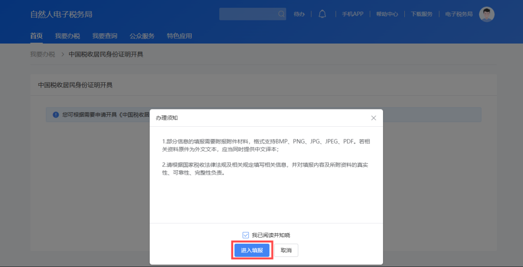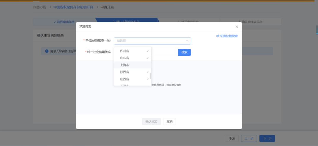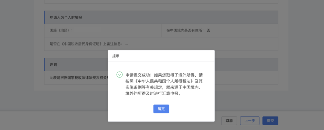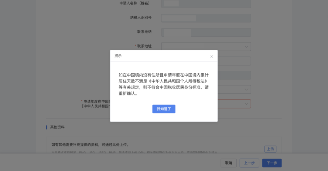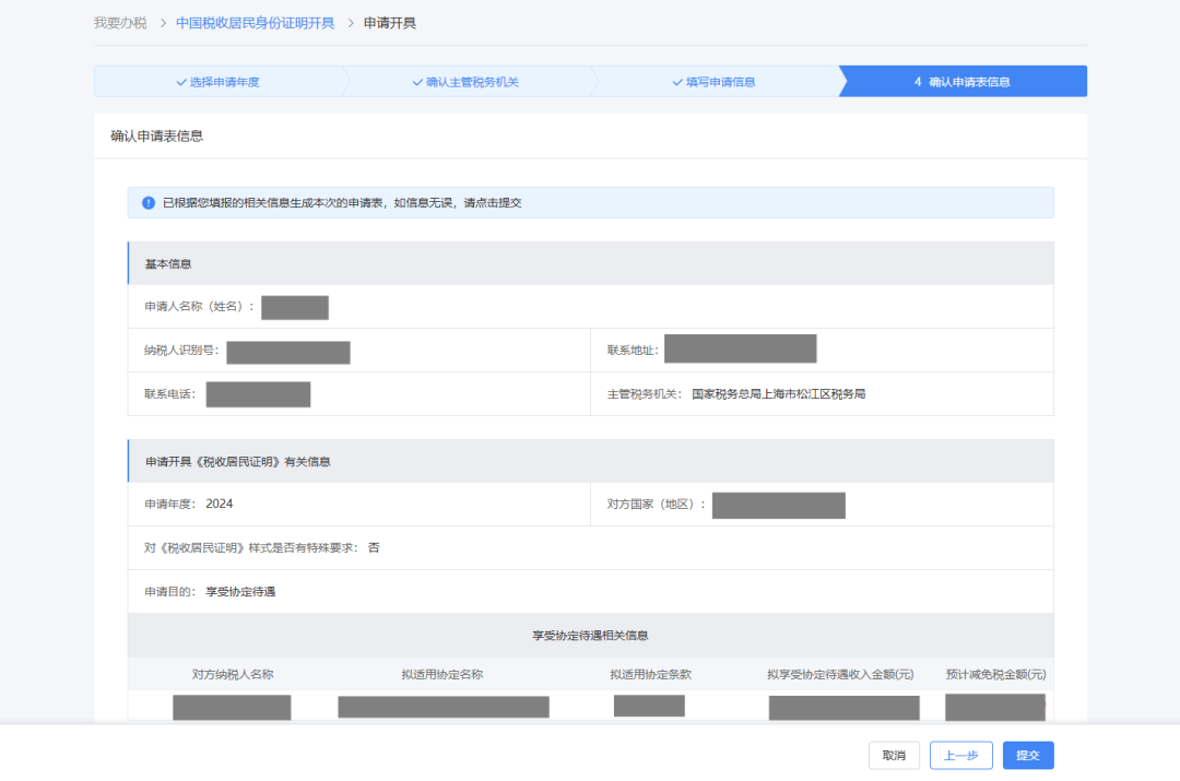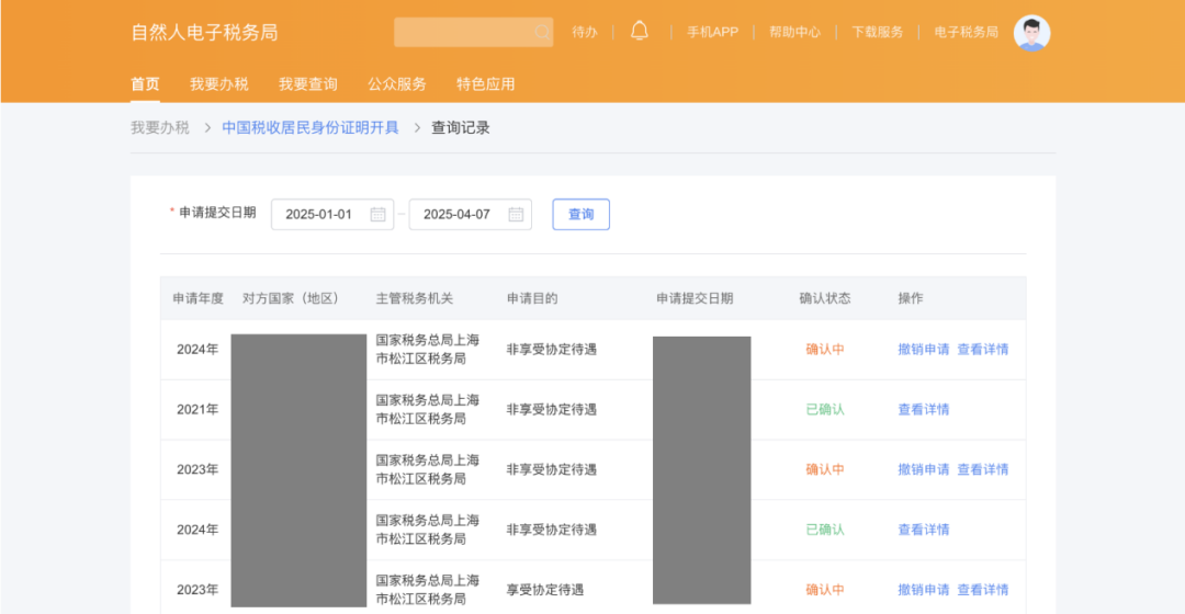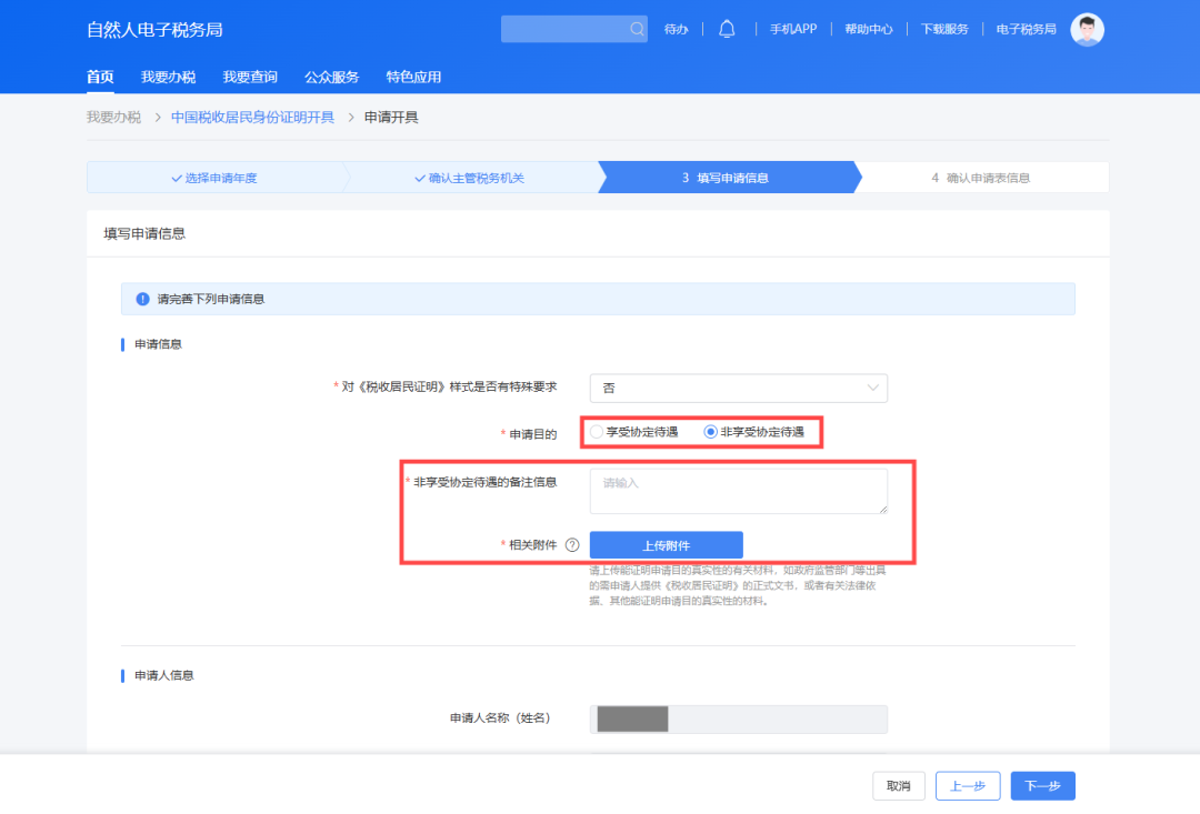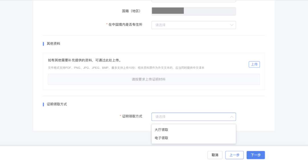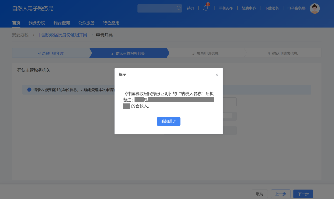居民个人新版中国税收居民身份证明线上办理流程如下: 第二步,系统将提示办理须知,勾选【我已阅读并知晓】,进入填报。 第三步,选择申请年度。需填写申请年度、对方国家(地区)及是否在《税收居民证明》上备注信息。申请人可以就其构成中国税收居民的任一公历年度开具《税收居民证明》。 若申请人为中国境内注册登记的个体工商户、个人独资企业或合伙企业,并且需要在《税收居民证明》上备注信息,请按自身登记注册类型勾选对应选项并上传登记注册证书;若不属于上述情形,请勾选【无需备注信息】。 第四步,确认主管税务机关。若申请人在“是否在《中国税收居民身份证明》上备注信息”勾选【无需备注信息】,主管税务机关规则可选择【户籍所在地】或【经常居住地】。 若申请人在“是否在《中国税收居民身份证明》上备注信息”勾选相关选项,需录入要备注的单位信息,以确定受理本次申请的主管税务机关。点击【单位纳税人识别号】,可在弹窗中输入统一社会信用代码或单位名称,点击【搜索】,查询单位信息。如“快捷搜索”未查询出您的企业,可点击切换为“精准搜索”进行查找。“单位所在省(市一级)”选择企业所在省/市,输入统一社会信用代码进行搜索。 以合伙企业为例,查询到单位信息后,勾选企业,点击确认添加,如申请人与被选企业存在投资关系,系统提示“《税收居民证明》的纳税人名称后拟备注:XX(居民个人名称)是XXXXX(企业名称)的合伙人”;反之,系统提示“您与该单位不存在投资关系,不可备注该企业。” 录入需备注的单位信息后,点击【下一步】。 第五步,填写申请信息。如果“对《税收居民证明》样式是否有特殊要求”选择【是】,需上传“需要特殊样式的书面说明以及《中国税收居民身份证明》样式”,“证明领取方式”只能选择【大厅领取】。 “申请目的”可选择【享受协定待遇】或【非享受协定待遇】。若您选择【享受协定待遇】,需填写对方纳税人名称和拟适用协定名称等信息,并上传“与拟享受协定待遇收入有关的合同、协议、董事会或者股东决议、相关支付凭证等证明材料”。 若您选择【非享受协定待遇】,需填写【非享受协定待遇的备注信息】,并上传“能证明申请目的真实性的有关材料,如政府监管部门等出具的需申请人提供《税收居民证明》的正式文书,或者有关法律依据、其他能证明申请目的真实性的材料”。(该备注供税务机关审核使用,不会展示在最终出具的证明文本上)。 核对申请人信息。若“在中国境内是否有住所”选择【是】,“有住所个人提供因户籍、家庭、经济利益关系而在中国境内习惯性居住的证明材料或说明材料”可勾选【户籍】、【家庭】、【经济利益】并需上传相关材料,上述选项可多选。 若“在中国境内是否有住所”选择【否】,“申请年度在中国境内累计居住天数是否满足《中华人民共和国个人所得税法》等有关规定”可勾选【是】或【否】;若选择【是】,需提供“有关部门出具的申请人申请年度出入境记录”、“申请人申请年度护照”(港澳居民需提供《港澳居民来往内地通行证》,台湾居民需提供《台湾居民来往大陆通行证》)。 若选择【否】,系统将提示“如在中国境内没有住所且申请年度在中国境内累计居住天数不满足《中华人民共和国个人所得税法》等有关规定,则不符合中国税收居民身份标准,请重新确认”。 如您有其他需要补充提供的材料,可在“其他材料”模块上传。“证明领取方式”可选择【电子领取】或【大厅领取】。选择【电子领取】的,在税务机关确认通过后,可在自然人电子税务局接收到《税收居民证明》电子版。 第六步,核对您填写的申请表信息,如您核对无误点击【提交】,系统将提示“申请提交成功!如果您取得了境外所得,请按照《中华人民共和国个人所得税法》及其实施条例等有关规定,就来源于中国境内、境外的所得及时进行汇算申报。” 第七步,您可以在【我要办税】-【中国税收居民身份证明开具】-【查询已申请的记录】中查询办理进度。 领取证明 (2)若您选择大厅领取 新版《税收居民证明》取消了主管税务机关负责人签字,改为加盖主管税务机关公章。 |