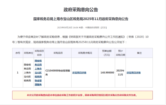 名称: 国家税务总局上海市宝山区税务局2025年11月政府采购意向