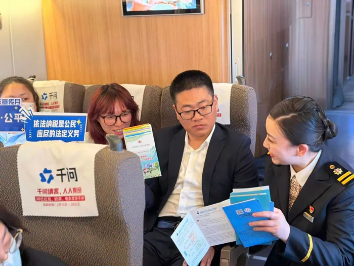 静安区税务局携手中国铁路上海局集团有限公司,在“东方号”品牌列车开展“税收·法治·公平”主题宣传活动。乘务人员向旅客发放宣传资料、普及税法知识、讲解便民办税举措,将税收法治理念融入旅途服务,展现铁路与税务联动普法新风貌。
