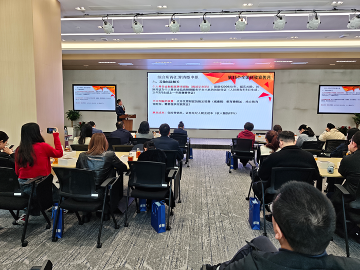 松江区税务局走进申田经济园区,面向企业财务人员及经营主体举办所得税政策专题宣讲会,税务干部围绕重点税收内容进行系统讲解,帮助企业准确掌握政策要点、开展合规经营,推动诚信纳税理念融入日常经营管理。