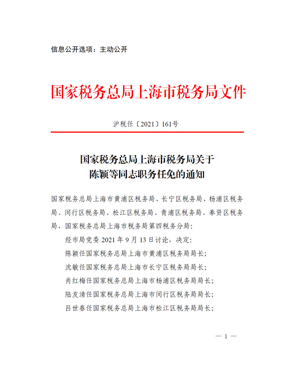 陈颖任国家税务总局上海市黄浦区税务局局长;