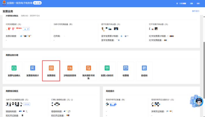 您可以点击【税务数字账户】-【发票业务】-【发票查验】,进入发票查验模块。