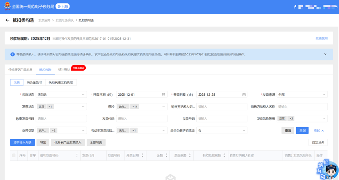 排查方法:排查发票状态是否为已勾选,排查方法可通过“全量发票查询”模块查看发票详情,或进入【发票勾选确认】-【抵扣类勾选】模块选择对应查询条件查询发票数据,或点击【统计确认】中的“确认历史信息”功能对往期勾选情况进行查询。