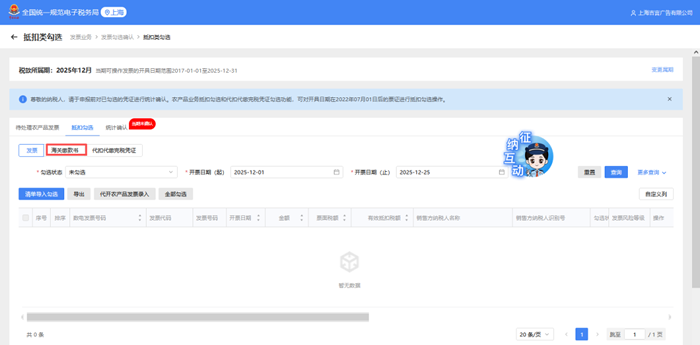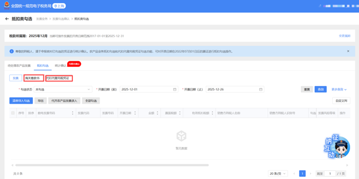 如果企业收到海关缴款书、代扣代缴凭证,需要进入【税务数字账户】-【发票业务】-【发票勾选确认】-【抵扣类勾选】-【抵扣勾选】-【海关缴款书】/【代扣代缴完税凭证】模块进行勾选提交。