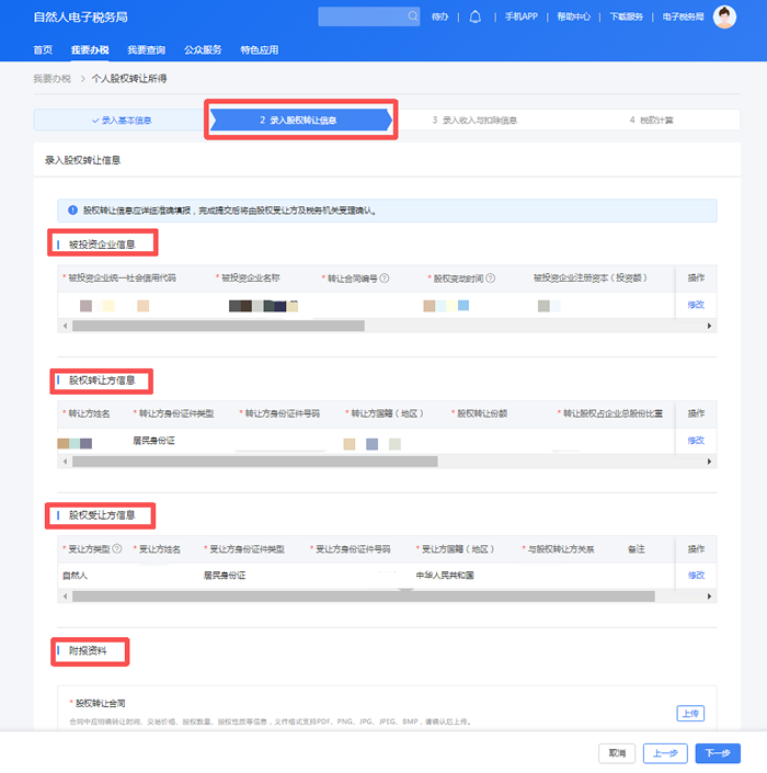 第四步:准确填写“被投资企业信息”“股权转让方信息”“股权受让方信息”,并按要求在指定位置报送“附报资料”,点击下一步。