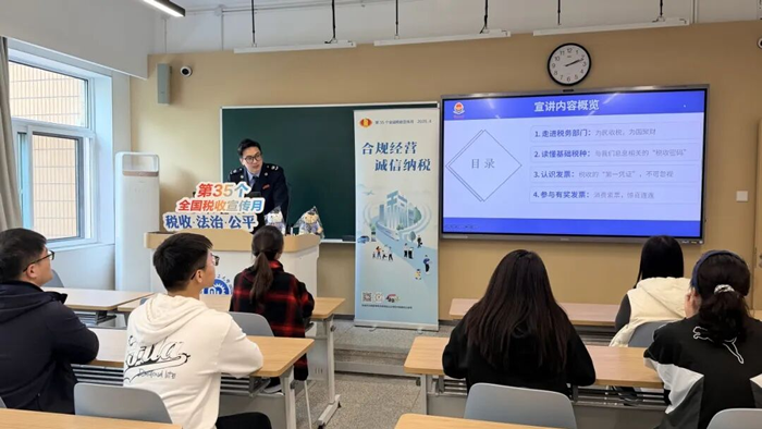 宝山区税务局走进华东理工大学开展税收宣传活动。税务干部在校园内设立咨询点,面向往来师生发放宣传手册,围绕个税年度汇算、专项附加扣除等热点内容进行面对面答疑;同时走进课堂,为经管专业学生开设专题讲座,结合案例讲解基础税种、有奖发票等内容,引导青年学子树立依法纳税意识,推动“税收·法治·公平”理念在校园落地生根。