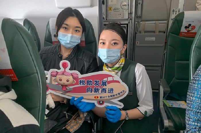 区局携手春秋航空,把“税助发展 向新而进”的税宣口号带上高空,创新渠道演绎“空中税宣”。空乘人员通过发放第33个全国税收宣传月宣传册等材料,为旅客讲解结构性减税降费政策,展示税务部门的贴心服务举措,推动“税惠红包”直达快享。