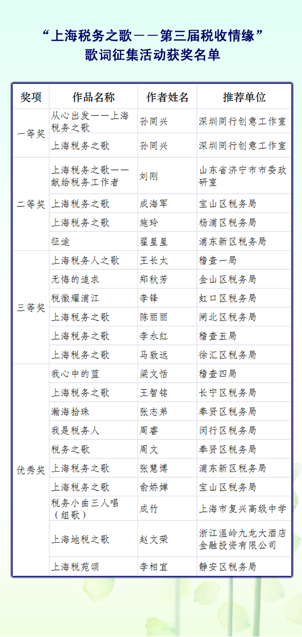 附件: “上海税务之歌--第三届税收情缘”歌词征集活动获奖名单