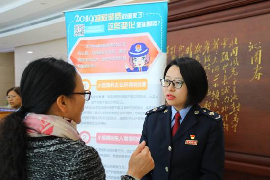 首先,宣传小队在商务楼一楼设摊,提供政策咨询服务。现场人头攒动,很是热闹。“4月1日降税率之后,我们是否还能开具老税率的发票?”“我们从一般纳税人转登记为小规模纳税人之后,对之前的业务如何开具红字发票?”“我们公司规模较大,有没有符合我们的优惠政策?”……面对纳税人提出的各类涉税问题,现场税务干部予以耐心细致的解答,同时,还主动了解纳税人的类型和经营情况,帮助他们罗列可能符合条件的优惠政策,让减税红利充分惠及纳税人。
