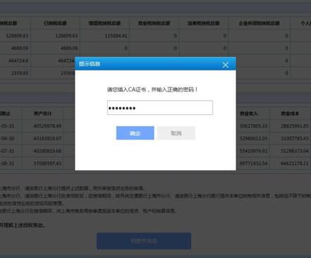 3.確認無誤後點擊“同意併發送”,系統將提示納稅企業插入CA證書,並輸入密碼