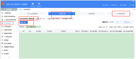 二、自然人電子稅務局(扣繳端)中申報個稅時,提示“上一屬期未按照6萬扣除減除費用”如何處理? ① 登錄自然人電子稅務局(扣繳端)-點擊【首頁】,將稅款所屬期改為當年1月份。 ② 依次點擊【綜合所得申報】-【正常工資薪金所得】-【收入和減除費用填寫】頁面-選擇該員工,點擊右上角【更多操作】-【減除費用扣除確認】-把【是】改為【否】,點擊確認。 ③操作完成後,將首頁的稅款所屬期改為當前申報月份,重新計算稅款,發送申報即可。