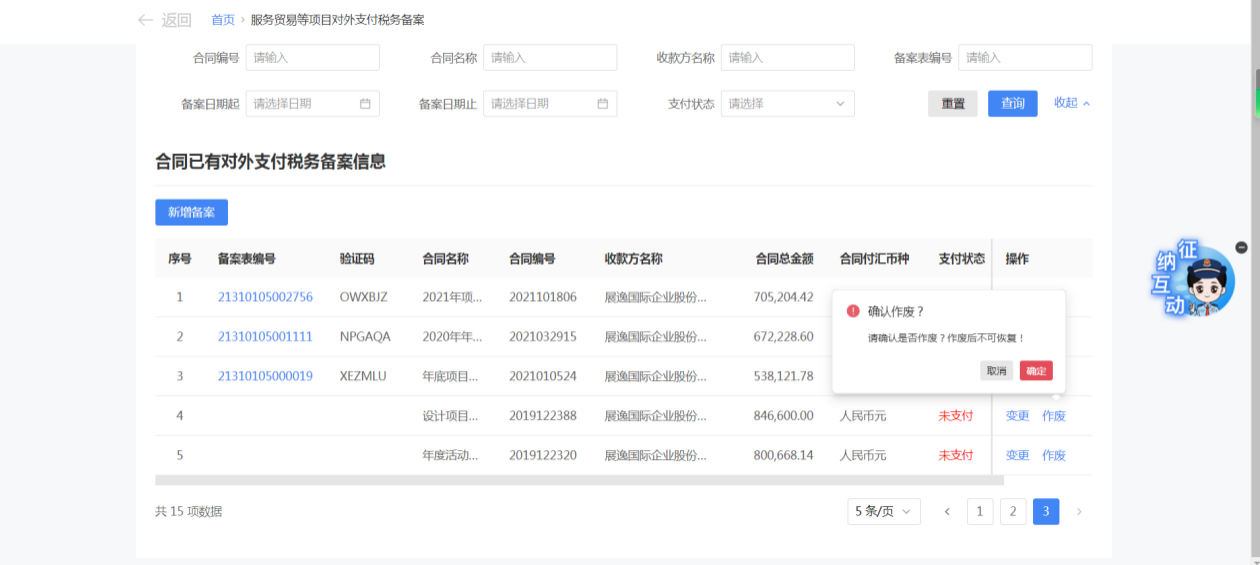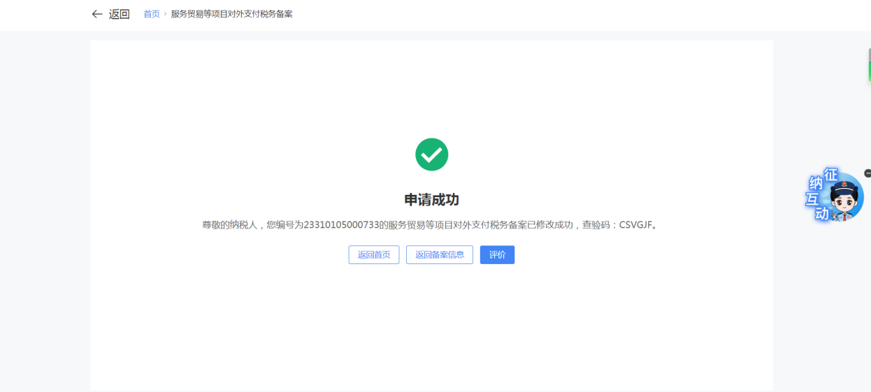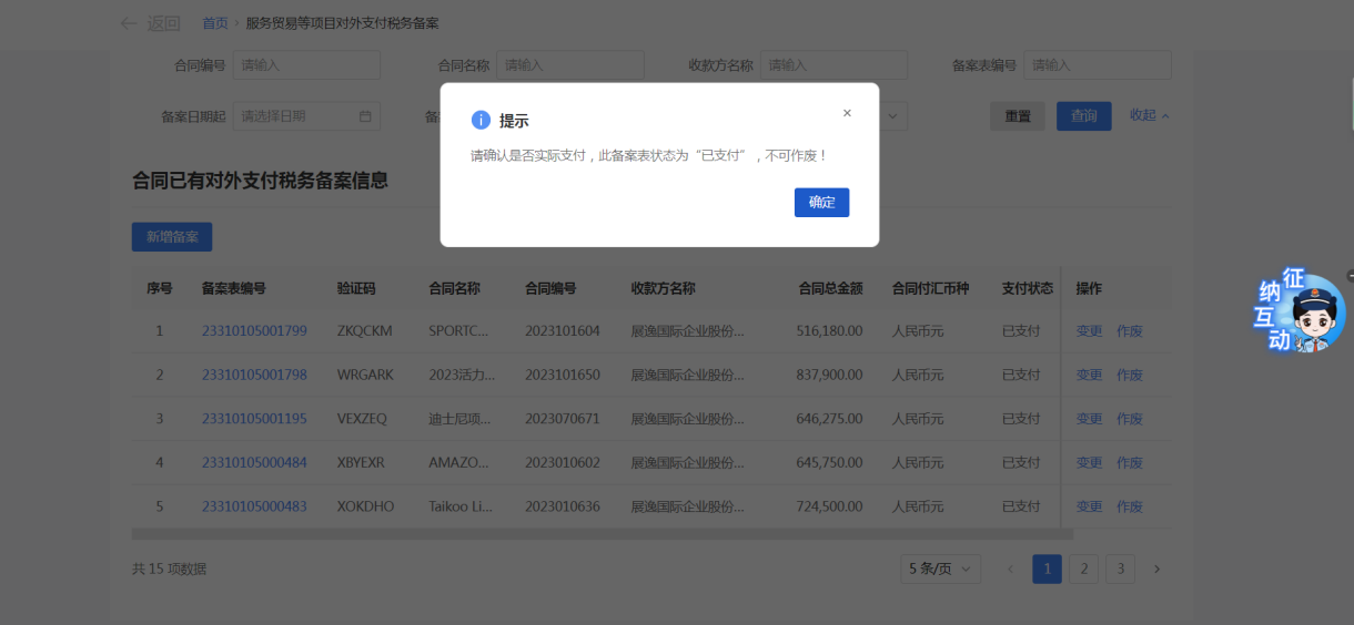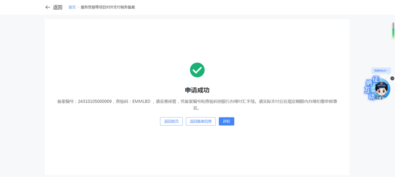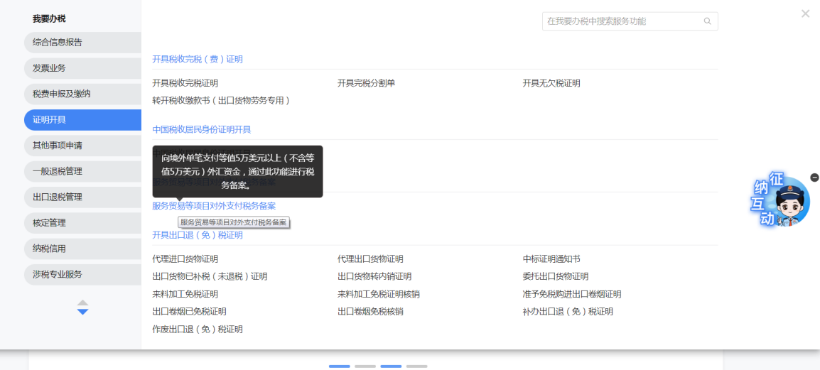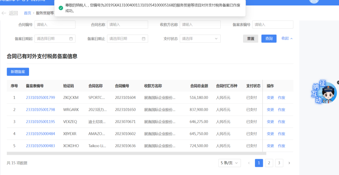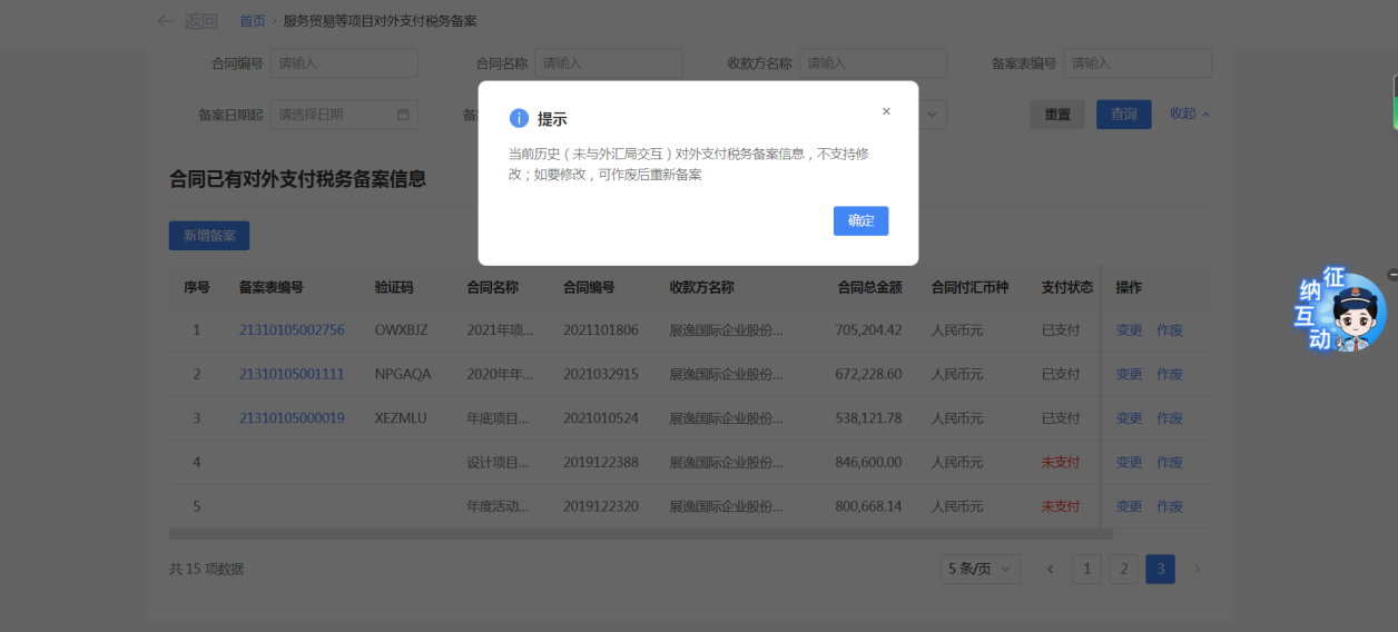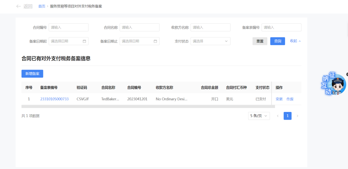 一、業務前提 境內機構和個人(以下稱備案人)向境外單筆支付等值5萬美元以上(不含等值5萬美元,下同)下列外匯資金,除《國家稅務總局 國家外匯管理局關於服務貿易等項目對外支付稅務備案有關問題的公告》(國家稅務總局公告2013年第40號發佈,國家稅務總局公告2018年第31號修改)第三條規定的情形和《國家稅務總局 國家外匯管理局關於服務貿易等項目對外支付稅務備案有關問題的補充公告》(國家稅務總局 國家外匯管理局公告2021年第19號)第二條規定的情形外,均應向所在地主管稅務機關進行稅務備案。 二、功能路徑 【我要辦稅】-【證明開具】-【服務貿易等項目對外支付稅務備案】 三、稅務備案流程 (一) 登錄新電子稅局後,點擊【我要辦稅】-【證明開具】-【服務貿易等項目對外支付稅務備案】功能功能表。 (二) 新增備案 (1)進入功能後,點擊“新增備案”按鈕; (2)選擇需要進行對外支付稅務備案的合同;無合同的情況下可以點擊“新增合同”按鈕,進行合同新增; (3)選擇合同後,點擊“確定”進入備案資訊填寫,資訊填寫完整後,點擊“下一步”; (4)上傳附送資料後,點擊“下一步”; (5)進入表單預覽,點擊“提交”; (6)提交成功。 (三)查詢備案資訊 根據納稅人查詢條件,可點擊“查詢”已備案資訊。 (四)更正備案資訊 (1)選擇需要更正的已備案記錄,點擊“變更”,填報操作參考新增備案; (2)更正成功。 (3)對於已備案但無備案表編號的歷史備案數據,不允許修改,只能作廢。點擊修改備案時彈出提示“當前歷史(未與外匯局交互)對外支付稅務備案資訊,不支援修改;如要修改,可作廢後重新備案”。 (五)作廢備案資訊。 (1)選擇需要作廢的已備案記錄,點擊“作廢”; (2)作廢成功。 (3)當已備案記錄的支付狀態為“已支付”時,不允許作廢。點擊作廢備案資訊時彈出提示“請確認是否實際支付,此備案表狀態為‘已支付’,不可作廢”。