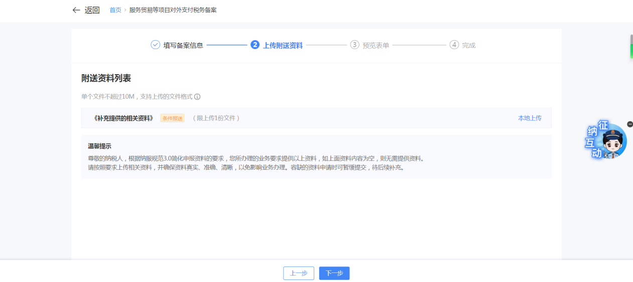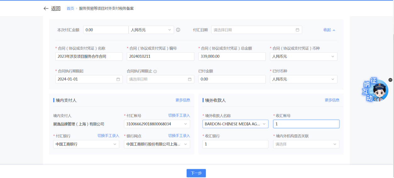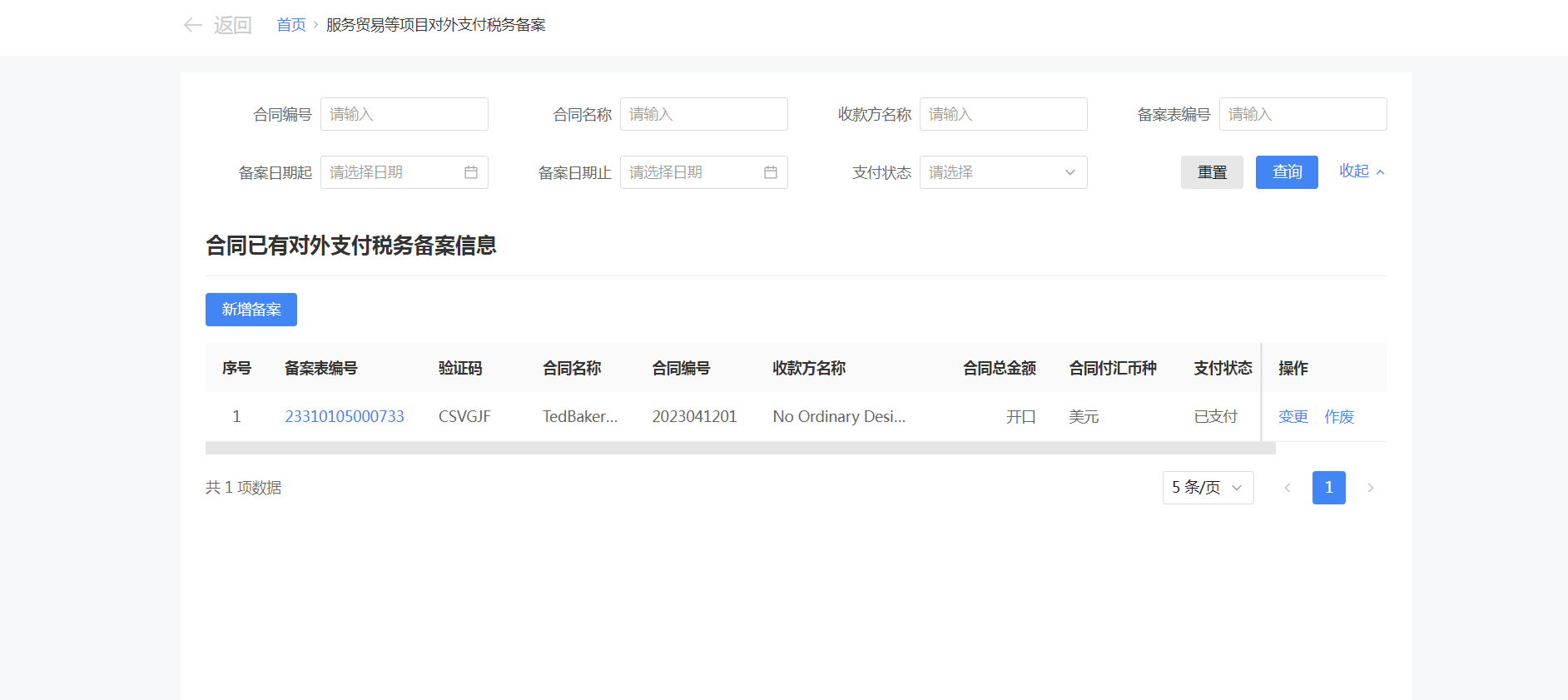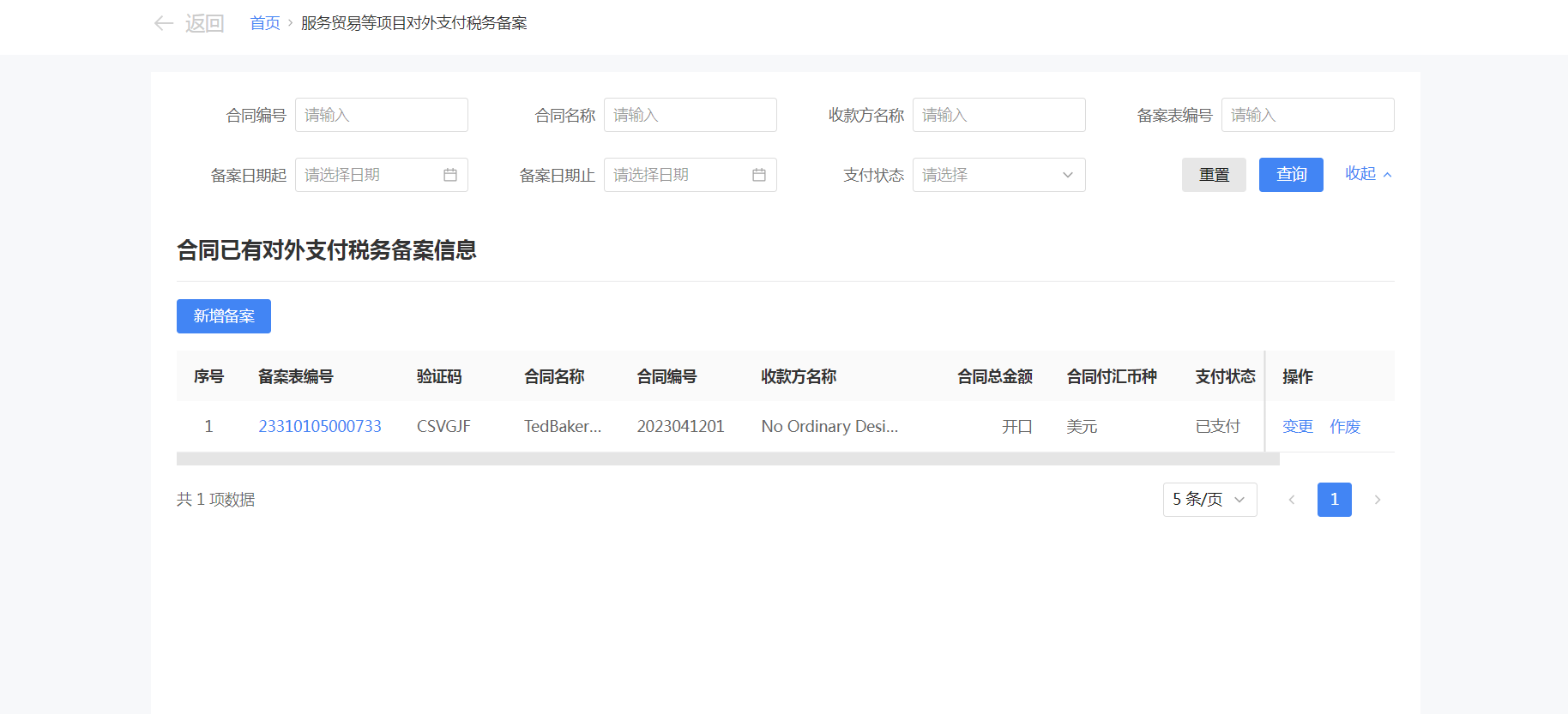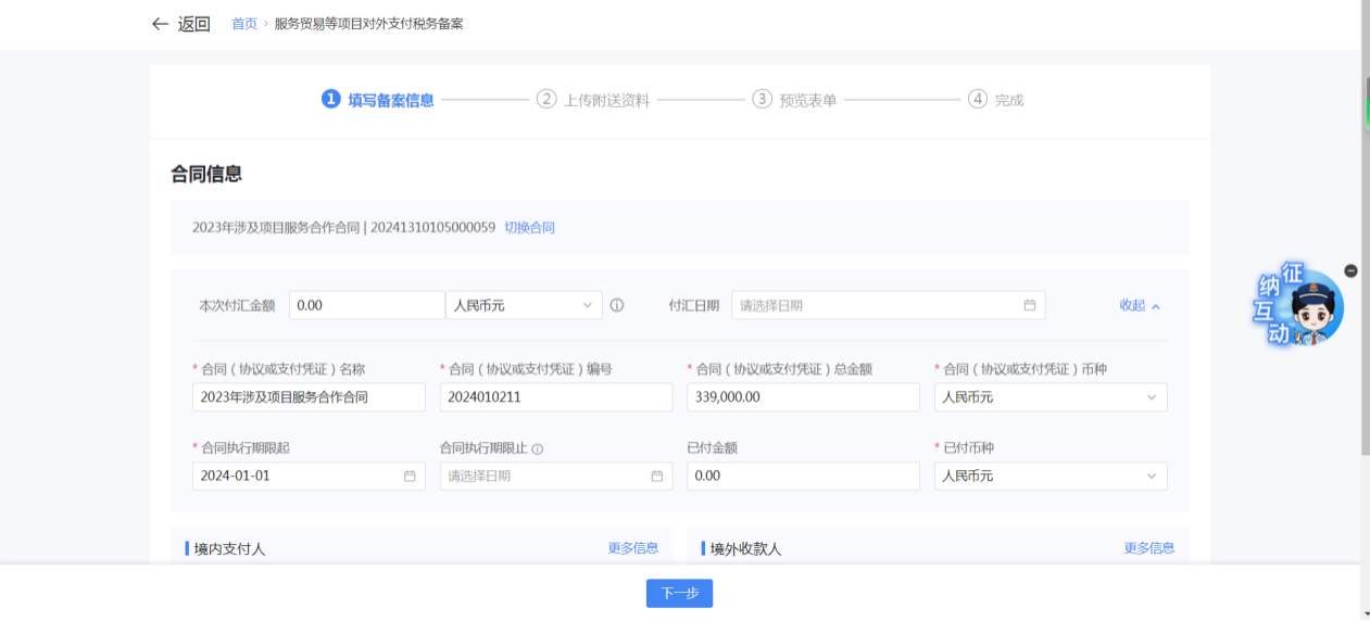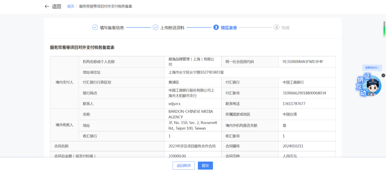 一、業務前提 境內機構和個人(以下稱備案人)向境外單筆支付等值5萬美元以上(不含等值5萬美元,下同)下列外匯資金,除《國家稅務總局 國家外匯管理局關於服務貿易等項目對外支付稅務備案有關問題的公告》(國家稅務總局公告2013年第40號發佈,國家稅務總局公告2018年第31號修改)第三條規定的情形和《國家稅務總局 國家外匯管理局關於服務貿易等項目對外支付稅務備案有關問題的補充公告》(國家稅務總局 國家外匯管理局公告2021年第19號)第二條規定的情形外,均應向所在地主管稅務機關進行稅務備案。 二、功能路徑 【我要辦稅】-【證明開具】-【服務貿易等項目對外支付稅務備案】 三、稅務備案流程 (一) 登錄新電子稅局後,點擊【我要辦稅】-【證明開具】-【服務貿易等項目對外支付稅務備案】功能功能表。 (二) 新增備案 (1)進入功能後,點擊“新增備案”按鈕; (2)選擇需要進行對外支付稅務備案的合同;無合同的情況下可以點擊“新增合同”按鈕,進行合同新增; (3)選擇合同後,點擊“確定”進入備案資訊填寫,資訊填寫完整後,點擊“下一步”; (4)上傳附送資料後,點擊“下一步”; (5)進入表單預覽,點擊“提交”; (6)提交成功。 (三)查詢備案資訊 根據納稅人查詢條件,可點擊“查詢”已備案資訊。 (四)更正備案資訊 (1)選擇需要更正的已備案記錄,點擊“變更”,填報操作參考新增備案; (2)更正成功。 (3)對於已備案但無備案表編號的歷史備案數據,不允許修改,只能作廢。點擊修改備案時彈出提示“當前歷史(未與外匯局交互)對外支付稅務備案資訊,不支援修改;如要修改,可作廢後重新備案”。 (五)作廢備案資訊。 (1)選擇需要作廢的已備案記錄,點擊“作廢”; (2)作廢成功。 (3)當已備案記錄的支付狀態為“已支付”時,不允許作廢。點擊作廢備案資訊時彈出提示“請確認是否實際支付,此備案表狀態為‘已支付’,不可作廢”。