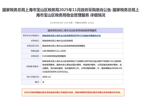 名稱: 國家稅務總局上海市寶山區稅務局2025年11月政府採購意向