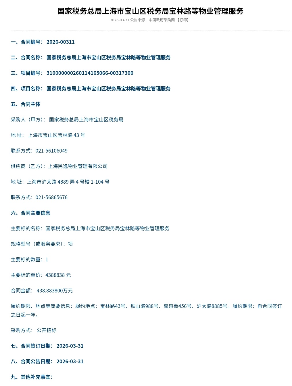 國家稅務總局上海市寶山區稅務局寶林路等物業管理服務合同公告
