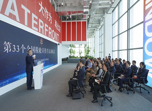 活動伊始,區局主要負責人發表致辭,介紹了策劃本次活動的背景和初衷,傳達了區局積極融入區域發展藍圖、共同“建設新徐匯、奮進新征程”的信念和信心。隨後,區局主要負責人和各委辦局領導及受邀重點企業代表共同上臺,啟動了徐匯區稅務局第33個全國稅收宣傳月。