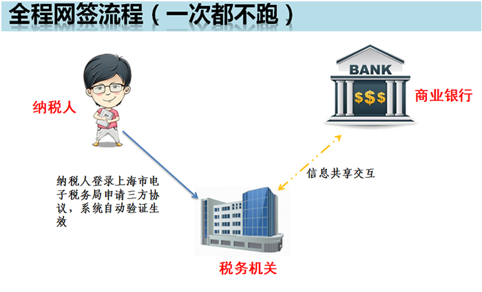 為進一步深化“放管服”、“網際網路+政務服務”改革,優化本市稅收營商環境,有效減輕納稅人、稅務機關和商業銀行負擔,本市自2018年7月31日起推行全程網上簽訂三方協議(以下簡稱“全程網簽”),實現三方協議申請、簽訂和驗證一鍵式自助辦理,充分運用資訊化手段解決納稅人反映的簽約繁瑣問題,有效減輕稅務機關、納稅人、商業銀行負擔,進一步增強納稅人獲得感。按納稅人類型為為企業納稅人和自然人納稅人。