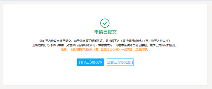 如果紙質簽訂申請提交成功,點擊【列印三方協議書】按鈕,列印《委託銀行劃繳稅(費)款三方協議書》,一式兩份,正反列印。列印成功後攜三方協議書至該銀行任意一個網點(比如您是建設銀行的銀行卡,選擇上海市任意一個建設銀行網點即可)辦理銀行審核三方協議。