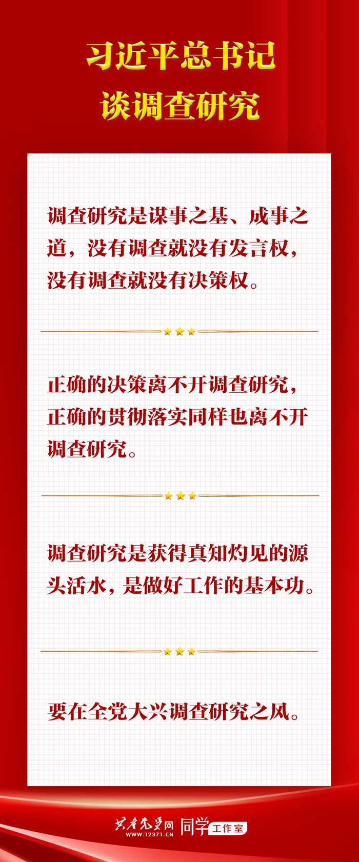 調查研究要注重實效,使調研的過程成為加深對黨的創新理論領悟的過程,成為保持同人民群眾血肉聯繫的過程,成為推動事業發展的過程。要防止為調研而調研,防止搞“出發一車子、開會一屋子、發言念稿子”式的調研,防止扎堆調研、“作秀式”調研。