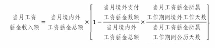在一個納稅年度內,在境內累計居住不超過90天的非居民個人,僅就歸屬於境內工作期間並由境內僱主支付或者負擔的工資薪金所得計算繳納個人所得稅。當月工資薪金收入額的計算公式如下(公式一):