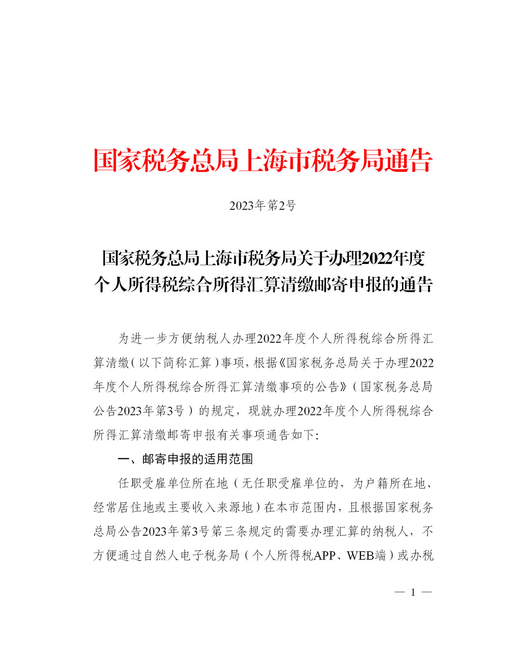 為進一步方便納稅人辦理2022年度個人所得稅綜合所得匯算清繳(以下簡稱匯算)事項,根據《國家稅務總局關於辦理2022年度個人所得稅綜合所得匯算清繳事項的公告》(國家稅務總局公告2023年第3號)的規定,現就辦理2022年度個人所得稅綜合所得匯算清繳郵寄申報有關事項通告如下: