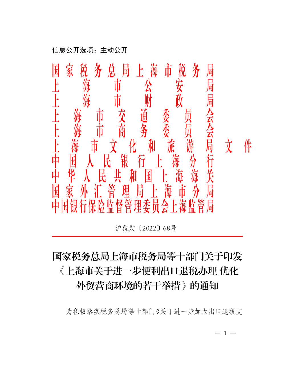 為積極落實稅務總局等十部門《關於進一步加大出口退稅支援力度 促進外貿平穩發展的通知》(稅總貨勞發〔2022〕36號),助力本市出口企業復工復産,全力優化外貿營商環境,經會商相關部門同意,現將《上海市關於進一步便利出口退稅辦理 優化外貿營商環境的若干舉措》印發給你們,請按照執行。