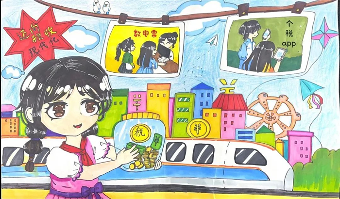 該作品以稅收“取之於民 用之於民”為基點,通過“數電票”試點、“個稅”APP退稅等方便納稅人的舉措以點帶面反映我國正在稅收現代化的路上行穩致遠,同時契合第32個全國稅收宣傳月“稅惠千萬家 共建現代化”的主題。(陶羽歆 5歲)。