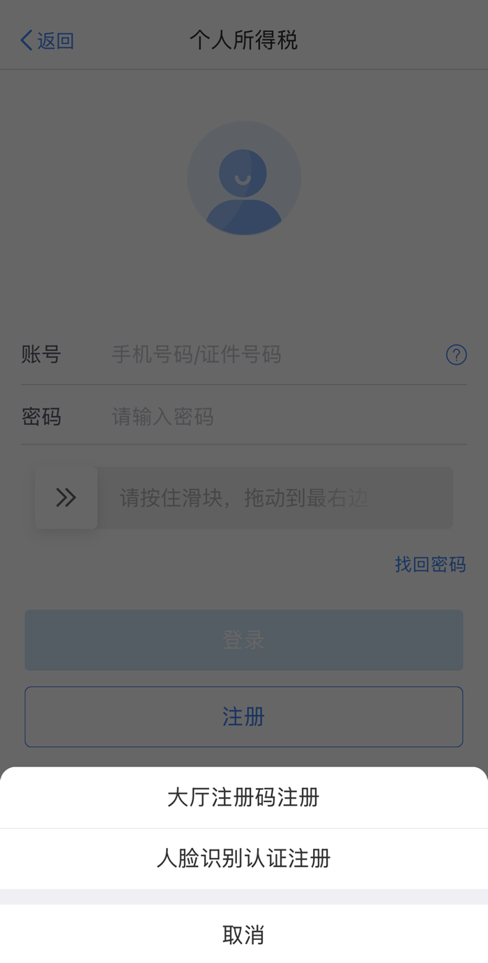 首先,我們打開個人所得稅App,點擊下方功能表欄【我的】-【註冊/登錄】,可以看到有兩種註冊方式——“人臉識別認證註冊”和“大廳註冊碼註冊”。
