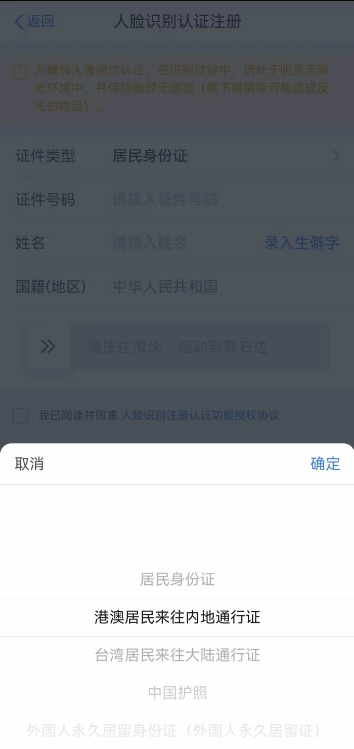 這時,我們需要先看看手裏面拿的有效證件是什麼類型。因為【人臉識別認證註冊】目前只支援居民身份證、港澳居民來往內地通行證、台灣居民來往大陸通行證、中國護照、外國人永久居留身份證(外國人永久居留證)、中華人民共和國港澳居民居住證和中華人民共和國台灣居民居住證。