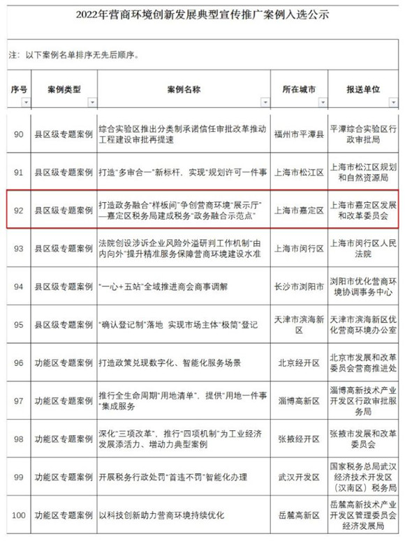日前,在由中国发展改革报社举办的2022年营商环境创新发展典型案例宣传活动中,嘉定区税务局“政务融合示范点”案例从全国1443个案例中脱颖而出,成功入选2022年全国100个营商环境创新发展典型宣传推广案例,获评为县区级专题案例。