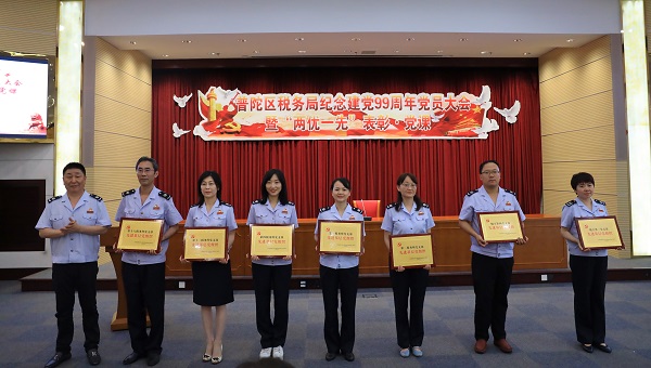 为庆祝中国共产党建党九十九周年,深入学习贯彻习近平新时代中国特色社会主义思想,有序推进“四史”学习教育,普陀区税务局召开庆祝建党九十九周年党员大会暨“两优一先”表彰·主题党课。