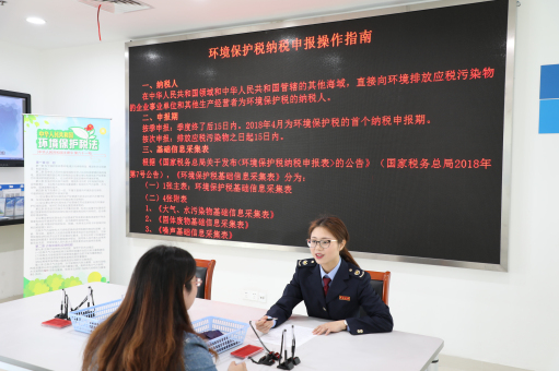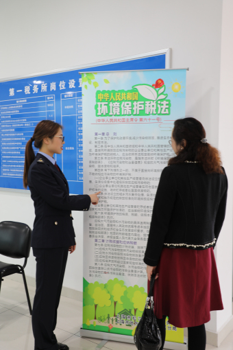 依照规定,环保税按季申报缴纳,4月1日是环境保护税首个征期的第一天,同时也是全国第27个税收宣传月的第一天。区局积极响应市局关于开展绿色税制改革宣传主题日活动的号召,办税服务厅当天正常上班,为环境保护税纳税人提供现场咨询、纳税申报等服务。