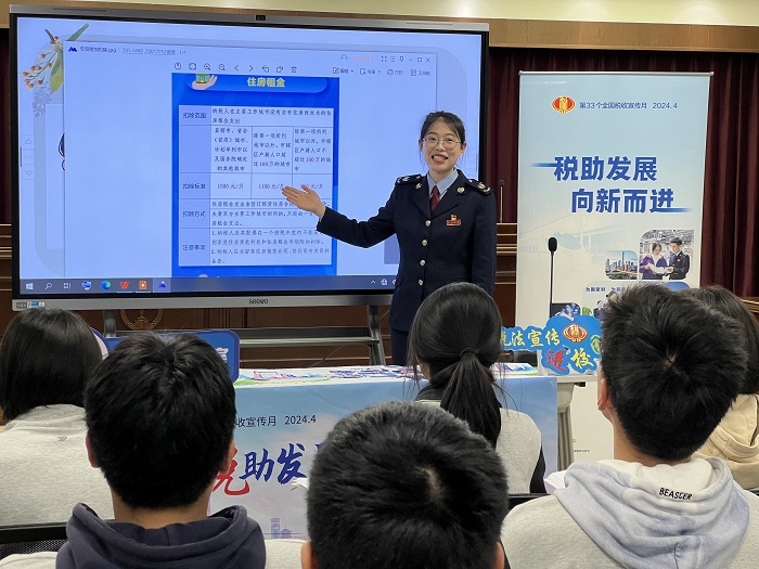 4月8日,区局税宣小分队走进松江二中,以二中建校120周年之树人讲坛为载体开展税收宣传活动,积极普及税收法治理念。税务干部结合日常生活,深入浅出地讲授了税收的内涵以及重要作用,并介绍了与学生家长息息相关的个人所得税相关优惠政策,帮助学生们更好理解税收,从小树立依法诚信纳税意识。