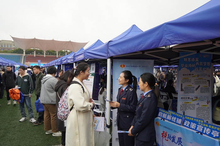 此外,区局还与区人社局、就业促进中心开展多元化合作,参与到松江大学城七校毕业生招聘会。来自区局“青创志愿服务队”的税务干部为招聘企业解读吸纳重点群体税收政策,同时为大学生送上《创业税收政策汇编》和“新办企业纳税服务卡”,帮助他们走好就业创业第一步。