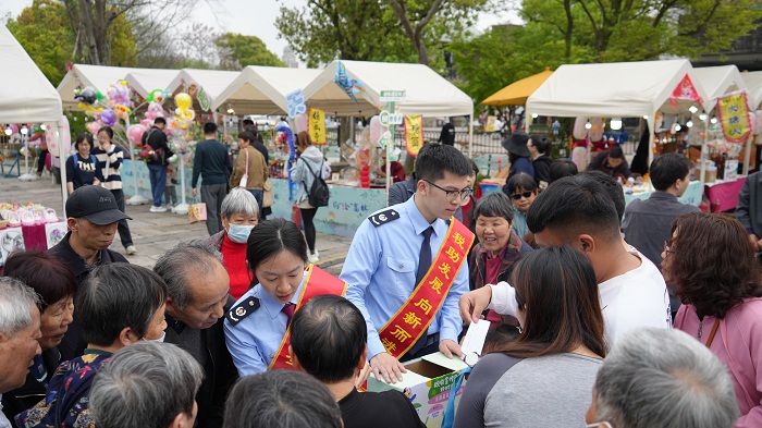 税宣小队在热闹的市集设点摆摊,“要不要体验一下税收知识小游戏”,税务干部“吆喝式”宣传吸引了不少游客积极参与,散步的老人、带幼儿的父母、踏春的年轻人纷纷来抽取题目。